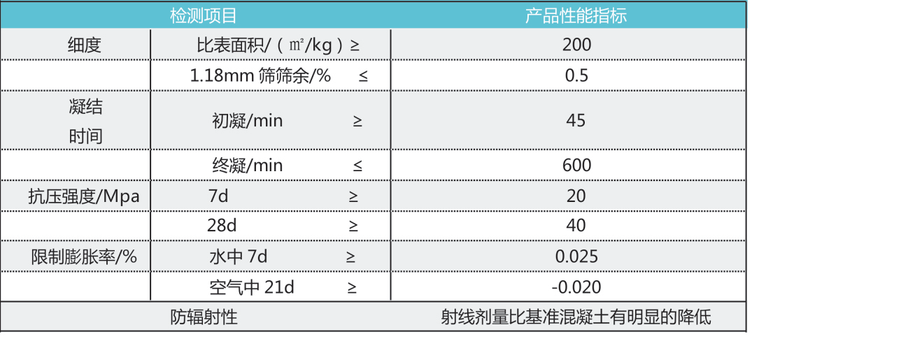 技術指標符合GB23439-2009《混凝土膨脹劑》、JC474-2008《砂漿、混凝土防水劑》和GB/T4835-2008《輻射防護儀器β、×和y輻射周圍和/或定向劑量當量(率)儀和/或監(jiān)測儀》標準中相應的技術指標。本產品能有效降低防輻射混凝土的孔隙率,提高密實性。